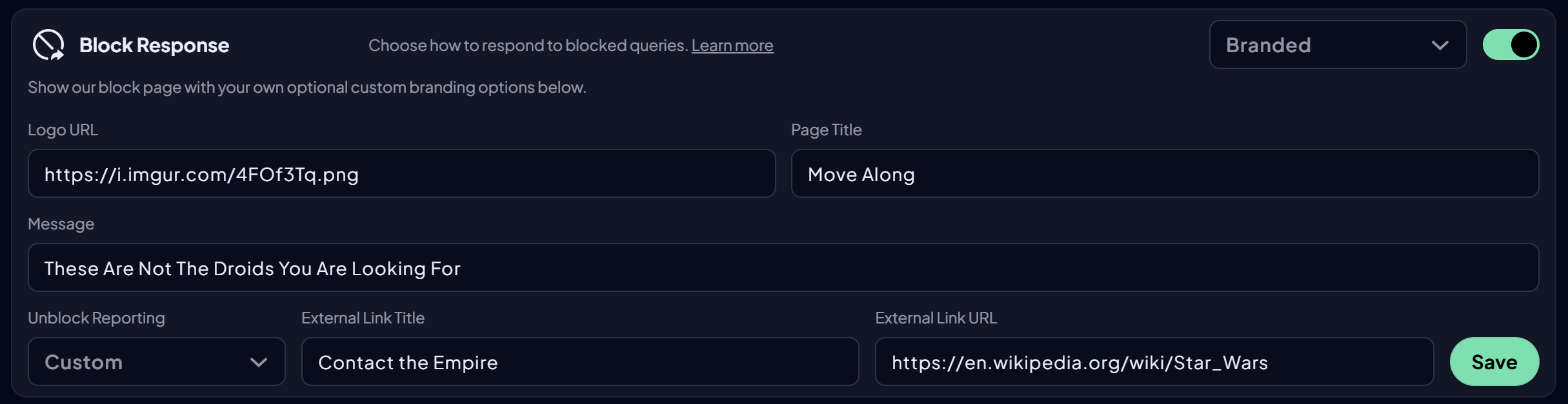 You can choose whether to show a Request Unblock button on a branded page using the Unblock Reporting dropdown which provides 3 options.