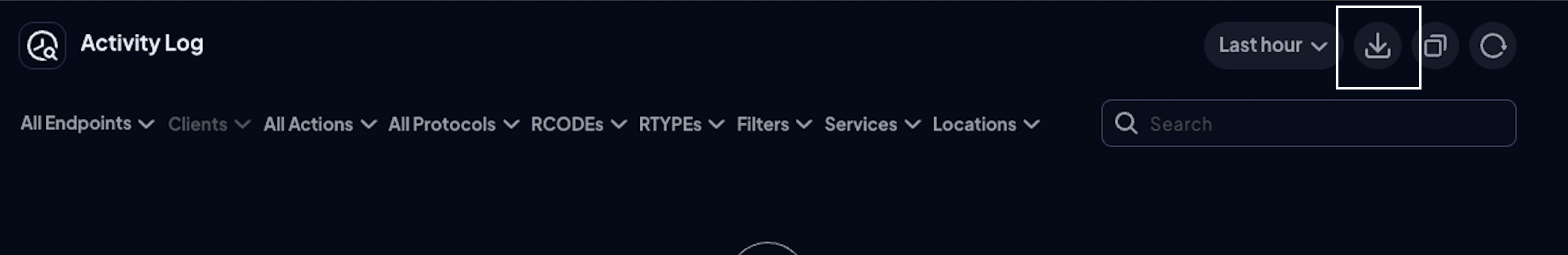 If you're looking to manually export your DNS query logs, simply navigate to Activity Log section, choose the desired Endpoint from the drop-down menu (or select All Endpoints) and click the export button.